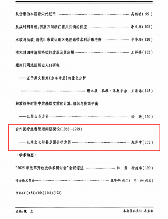 本网讯(通讯员 赵泽中)我院赵泽中先生在《中国经济史研究》揭晓题为《相助医疗经费治理问题探论(1966—1979)——以湖北长阳县乐园公社为例》的论文。