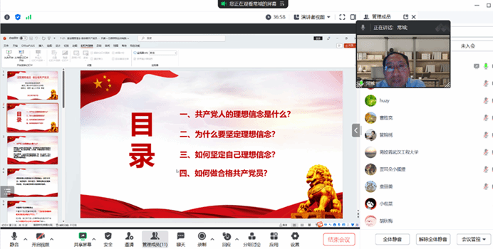 常城副院长指出,理想信心是中国共产党能够战胜艰难险阻,向导中国人民创立新中国的顽强意志,也是中国共产党能够恒久执政并获得人民群众拥护的精神英华,树立坚定的共产主义理想信心是及格共产党员的基本要求。其次,在怎样坚定自己的理想信心方面,常城副院长以坚持从理论学习中、坚持从知史明史中、坚持从践行宗旨中、坚持从对标先进中、坚持从做事创业中等“五个坚持”深入剖析共产党员坚定理想信心的要领途径,这是对共产党员怎样坚定理想信心最好的诠释。