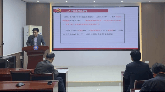 学院研究生事情办公室主任蔡明广首先汇报了学院结业生的基本信息及就业去向。2024届的87名应届结业生的就业意向主要分为三类:一是报考公务员或事业单位 ;二是进入教育或科研领域,包括思政课西席和向导员职位 ;三是加入企业党务及理论宣传事情。蔡明广还详细剖析了目今高校的就业形势和现在结业生的就业情形,并从就业事情的目的、战略、增强就业教育和步队建设等方面举行了详细汇报。