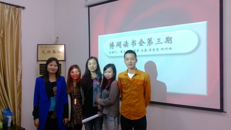 2014年4月23日,人生就是博“博闻”念书会在学院聚会室顺遂举行。本期念书会由我院学生会主席刘存地、学术部部长付肖肖主持,组织学院研究生起劲加入。本次念书会的主讲人划分是谢莎莎、王泉、黄文娟、何巧玲、付肖肖,五位同砚以“选择绿色生涯,离别十面‘霾’伏”为主题,划分作了精彩生动的报告。
